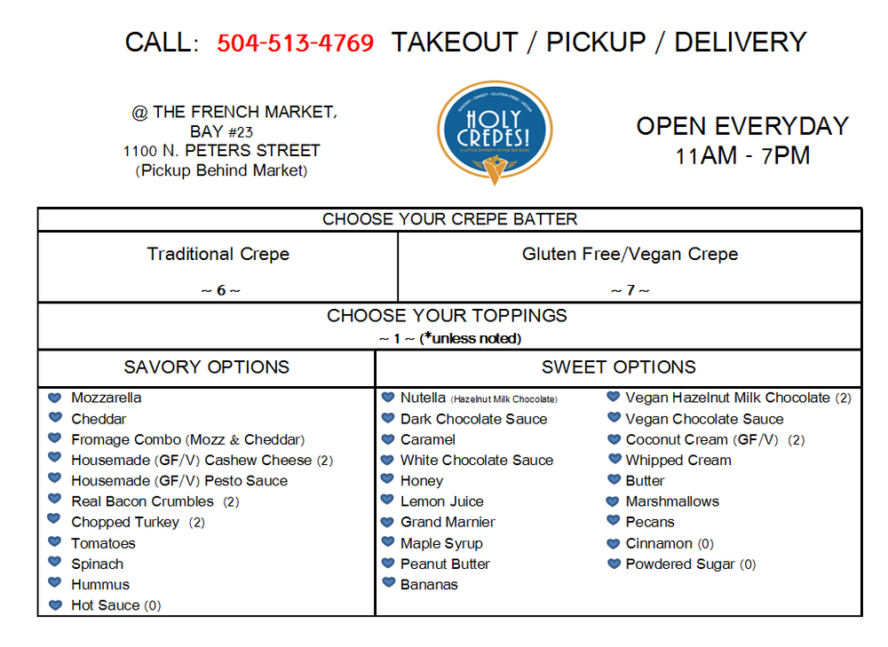 Nestled in the heart of New Orleans at the French Market, Holy Crepes! offers a vibrant menu of vegan and gluten-free crepes that delight the senses. Whether you're after a savory option like the Le Pesto with fresh veggies and housemade pesto, or craving a sweet indulgence like the Smores filled with Nutella and marshmallows, there's something for everyone.